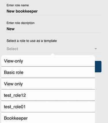 Enter a role name and description. Then select a template. Tap Next. Example role names: admin, bookkeeper, accountant, John Smith. Example role descriptions: view only, full access, limited access.