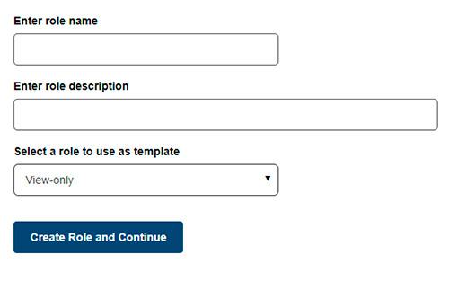 Enter a role name and description. Select a template. Click Create Role and Continue. Example role names: admin, bookkeeper, accountant, John Smith. Example role descriptions: view only, full access, limited access.