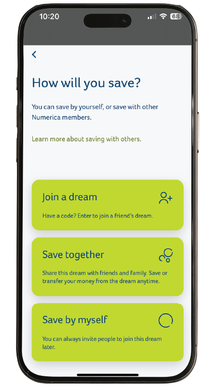 You can keep your dream private or invite friends and family who are Numerica members to save toward the same goal.